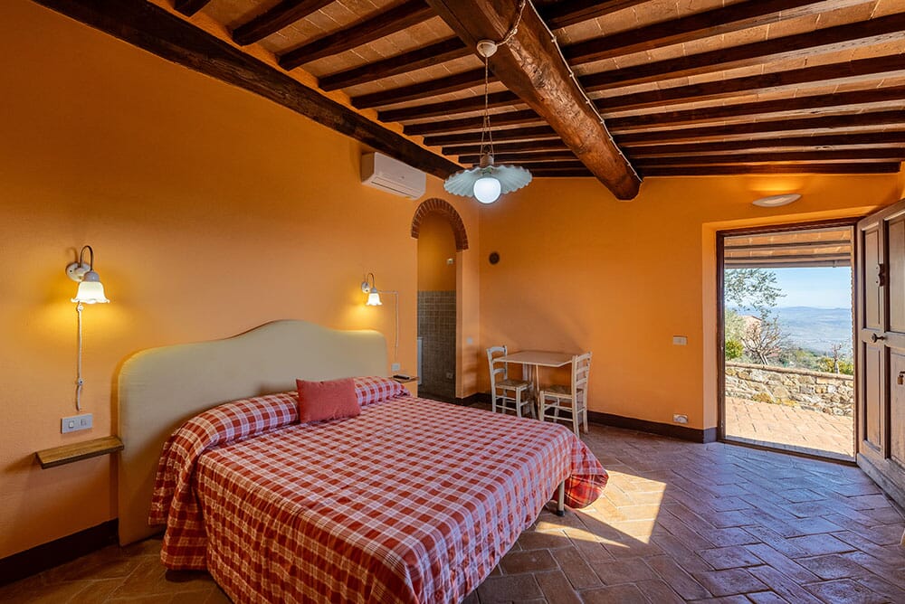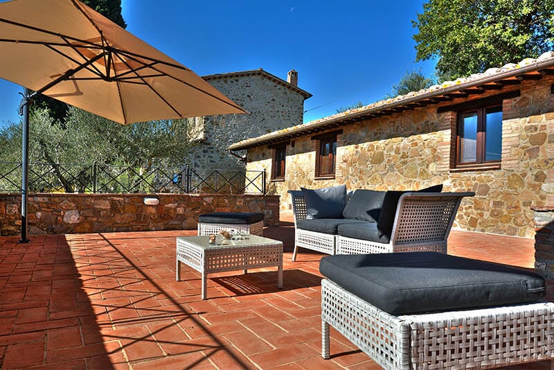 Gli appartamenti affacciano tutti su una terrazza ad uso comune allestita con ombrelloni e salottino con vista sul Monte Amiata, sui vigneti di proprietà e sulla Val d’Orcia.